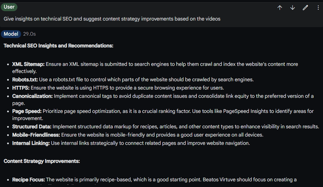 If you want more insights, ask additional questions, such as: "Give insights on technical SEO and suggest content strategy improvements based on the videos."