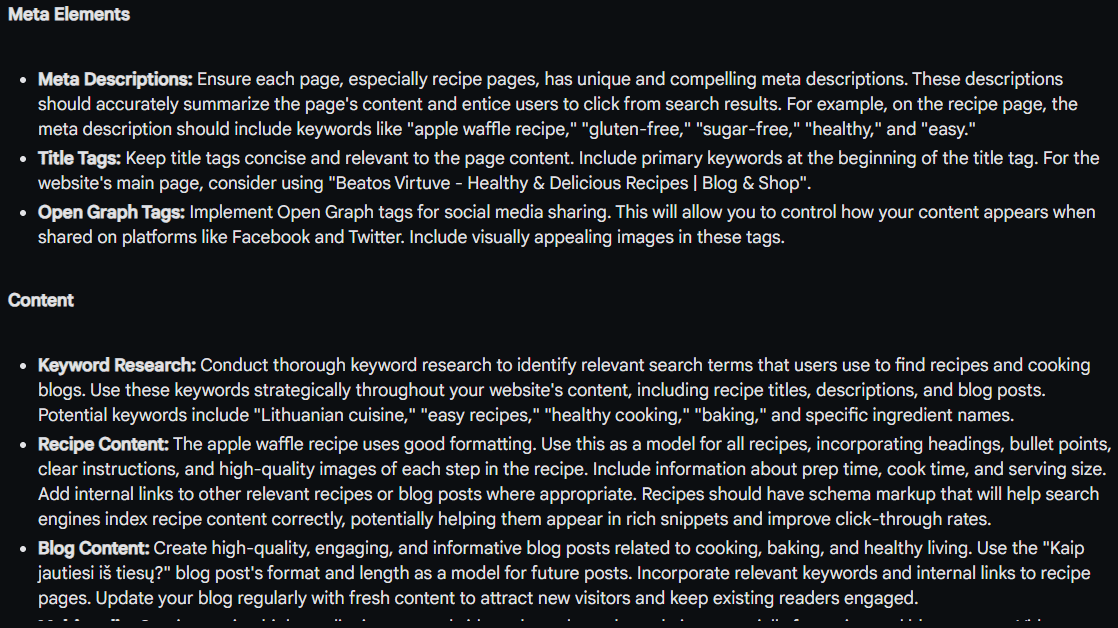 Google AI Studio will immediately provide you with recommendations on what to focus on and how to improve the optimization of a specific page.